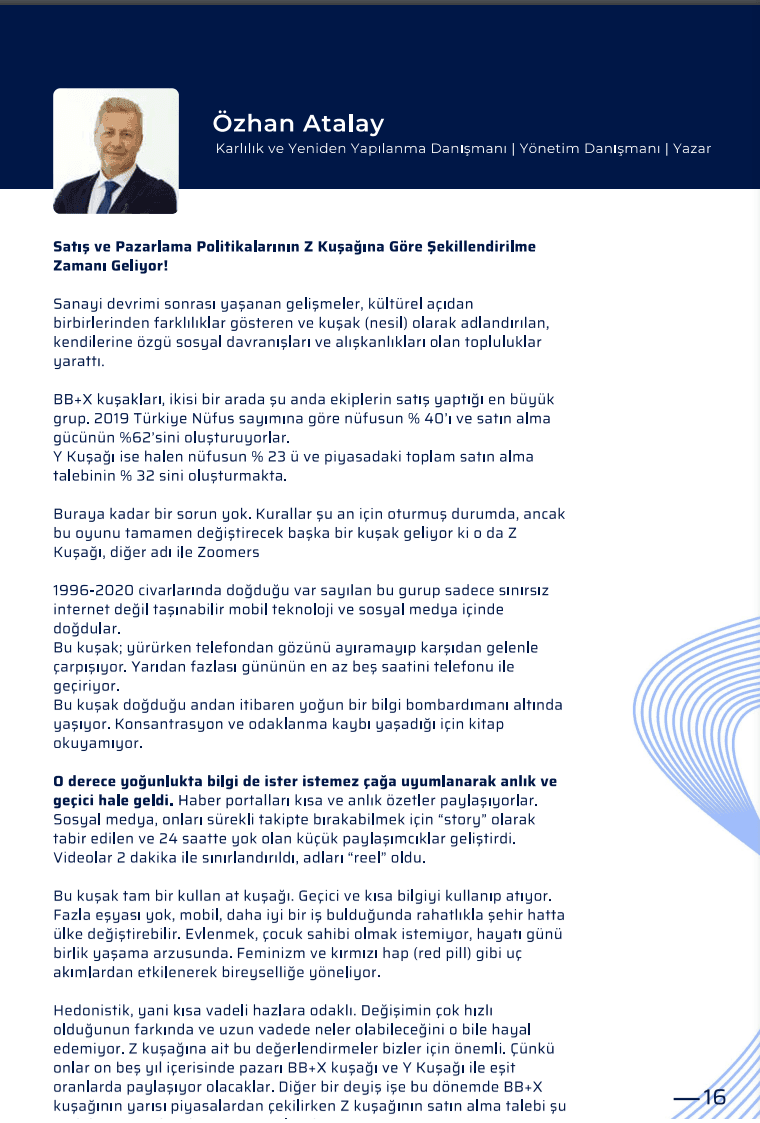 Günümüzün satış ve pazarlama aktivitelerini idare eden Y kuşağının önündeki en büyük sorun, pazar alt yapısını Z kuşağına göre hazırlamak olacak.